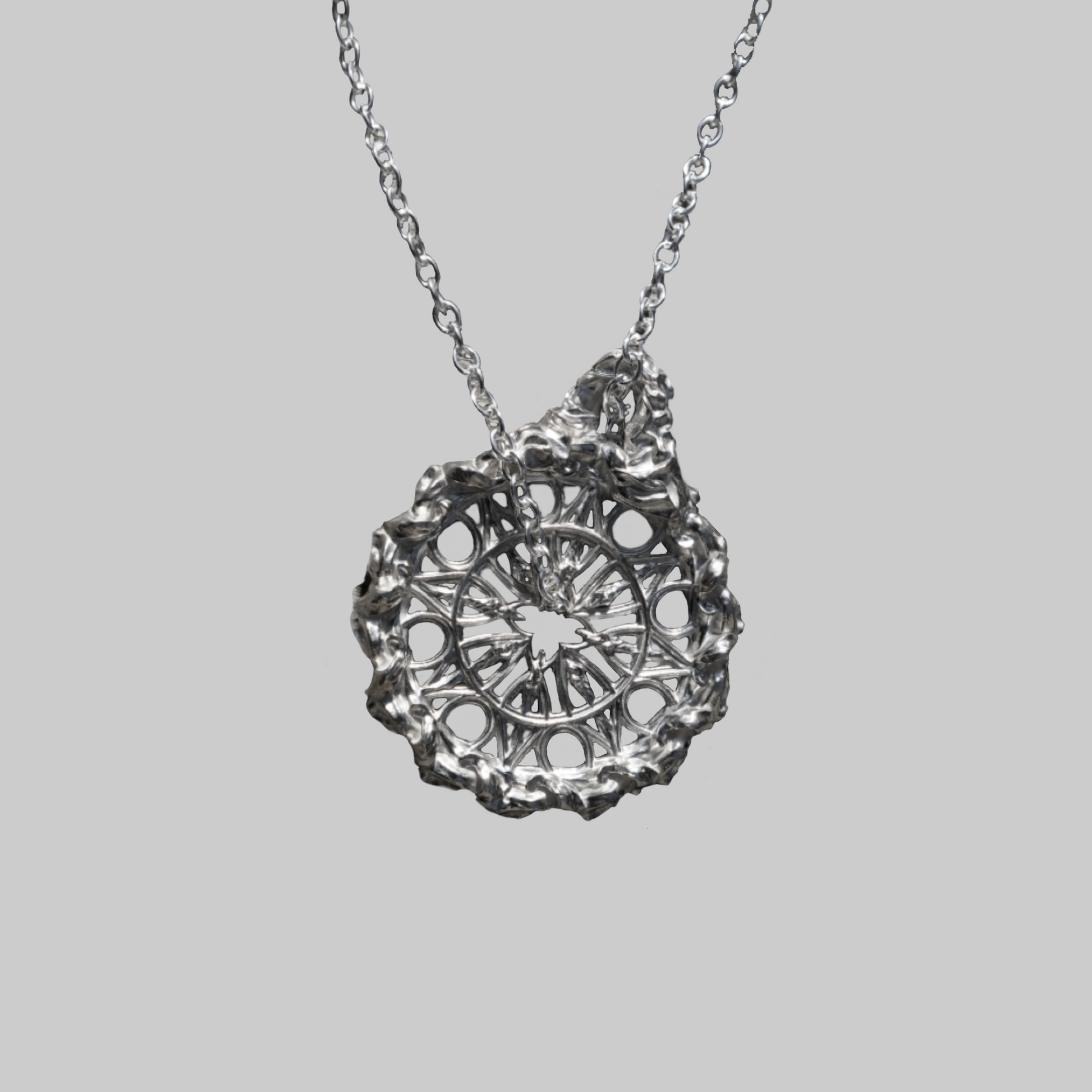 A circle of shadow and light, this pendant draws inspiration from gothic rose windows and the steady rhythm of clockwork.